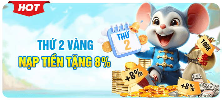 Nhà cái 88fly.com tặng thêm 8% giá trị tiền nạp của hội viên, áp dụng với những lệnh nạp thực hiện vào thứ 2 hàng tuần. Đặc biệt: Không giới hạn số tiền tặng, nạp nhiều thưởng nhiều.